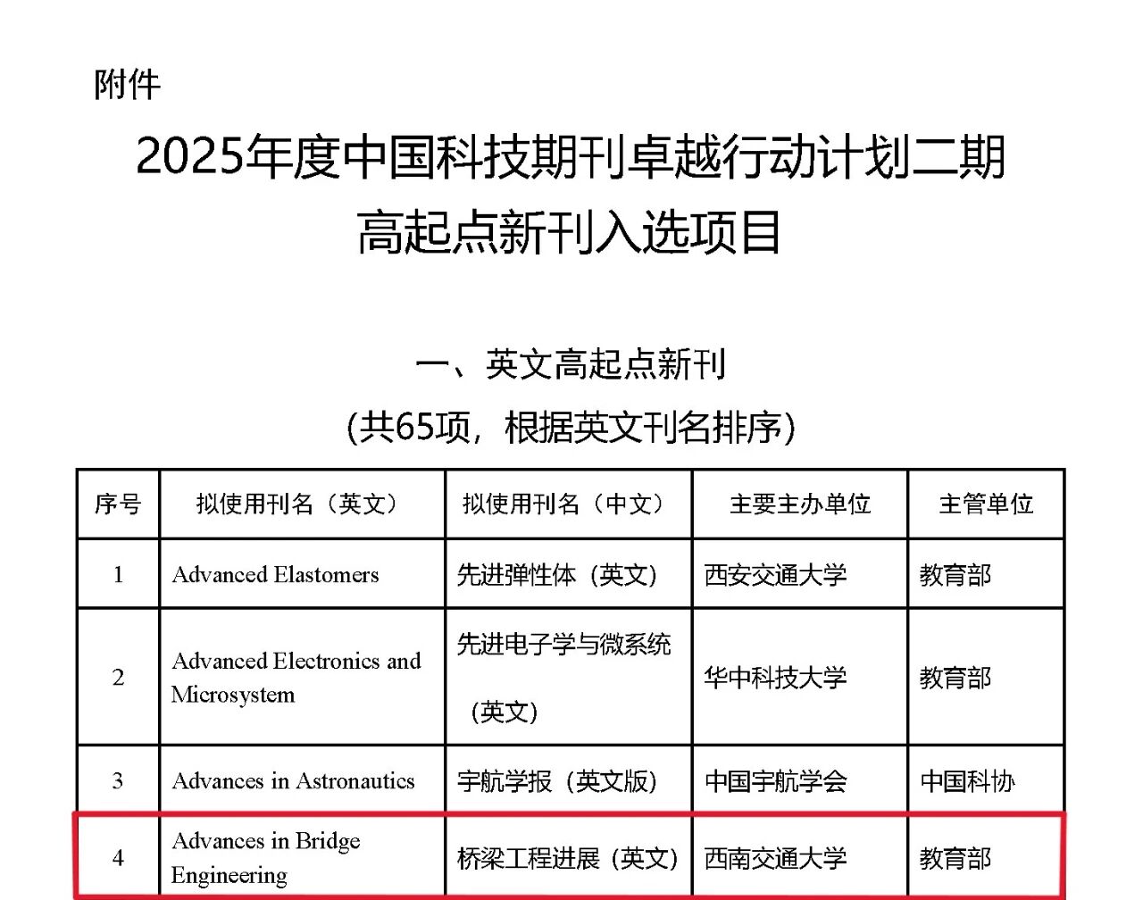 12月5日,中国科技期刊卓越行动计划二期高起点新刊正式公布,《Advances in Bridge Engineering》(桥梁工程进展)国际期刊成功入选。在西南交通大学及土木工程学院、桥梁绿色与智能建造全国重点实验室的支持下,《桥梁工程进展》国际期刊积极参与中国科技期刊卓越行动计划,由主编秦顺全院士、李永乐教授组织申报并汇报答辩。
